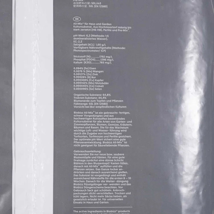 BioBizz All-Mix ist Anbauerde mit einem vollständigen, mikroaktiven Ökosystem. Die Komposition aus wertvollen Torfarten, Wurmmist und Perlite ist reichhaltig vorgedüngt und hat ein harmonisch-ausgewogenes Bodenleben.