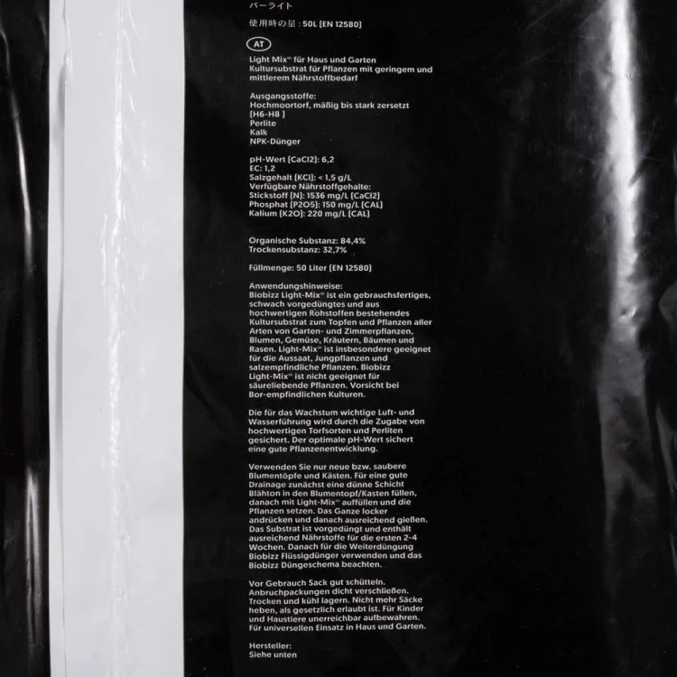 Der Light-Mix® ist vorgedüngt und versorgt deine Pflanzen in den ersten 2-4 Wochen mit allen notwendigen Nährstoffen. Für die weitere Nährstoffversorgung empfehlen wir die Verwendung von Biobizz Flüssigdünger entsprechend dem Biobizz Düngeschema.