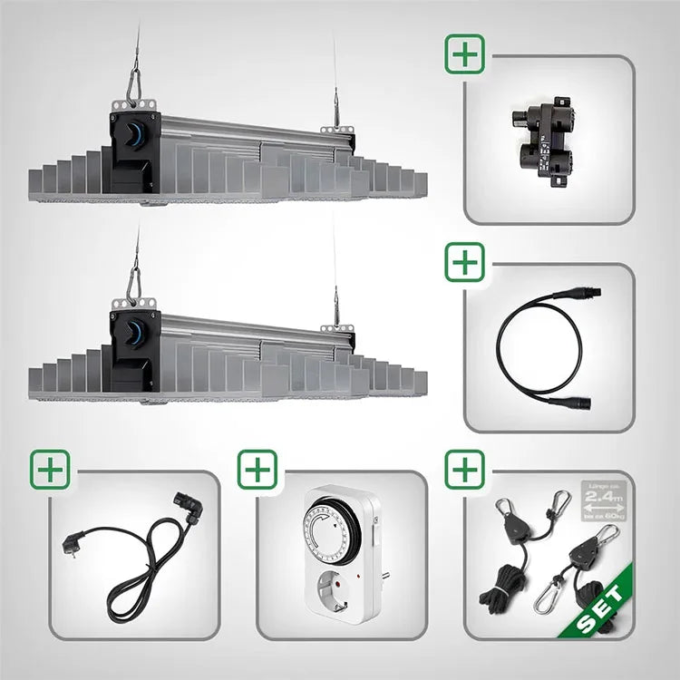 Um eine Growbox mit einem Quadratmeter Anbaufläche effektiv auszuleuchten, empfiehlt SANlight den Einsatz von zwei EVO 3-100 1.5. In diesem Set sind neben den beiden LED-Lampen gleich die nötigen Kabel und ein H-Verteiler dabei. Zusätzlich enthalten sind noch zwei GrowPRO-Ratschensets für die unkomplizierte Aufhängung und eine mechanische Zeitschaltuhr. Im Set hast Du also direkt die passenden Kabel und nützliches Zubehör inklusive.